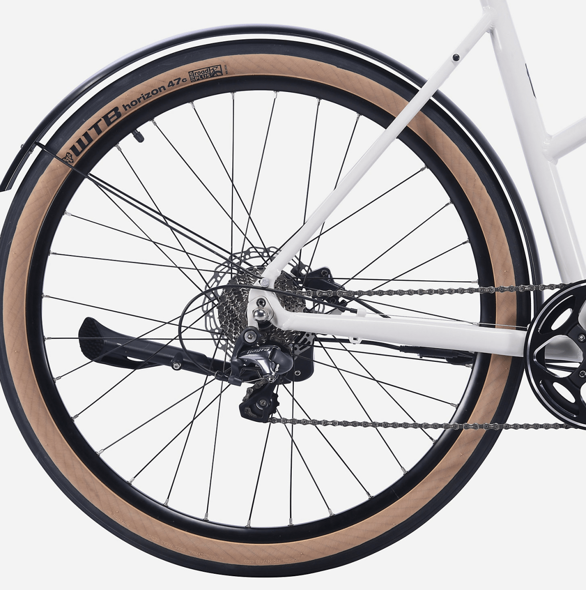 Les roues de 27,5 pouces du Roadster Open sont équipées de pneus WTB Horizon 650×47 mm. Ces pneus ont une excellente adhérence et stabilité sur tous les types de terrain urbain.