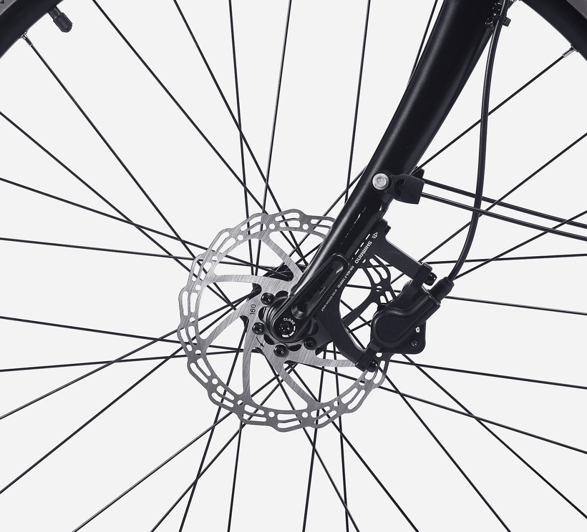 Les freins à disque hydrauliques Shimano procurent un freinage puissant et précis, assurant votre sécurité dans toutes les conditions. Avec des rotors de 160 mm, ils ne manquent pas de mordant.