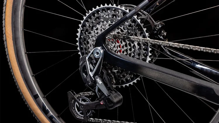 Transmission électronique précise : Sram XX SL Eagle AXS 1×12 avec dérailleur robuste et changement instantané.